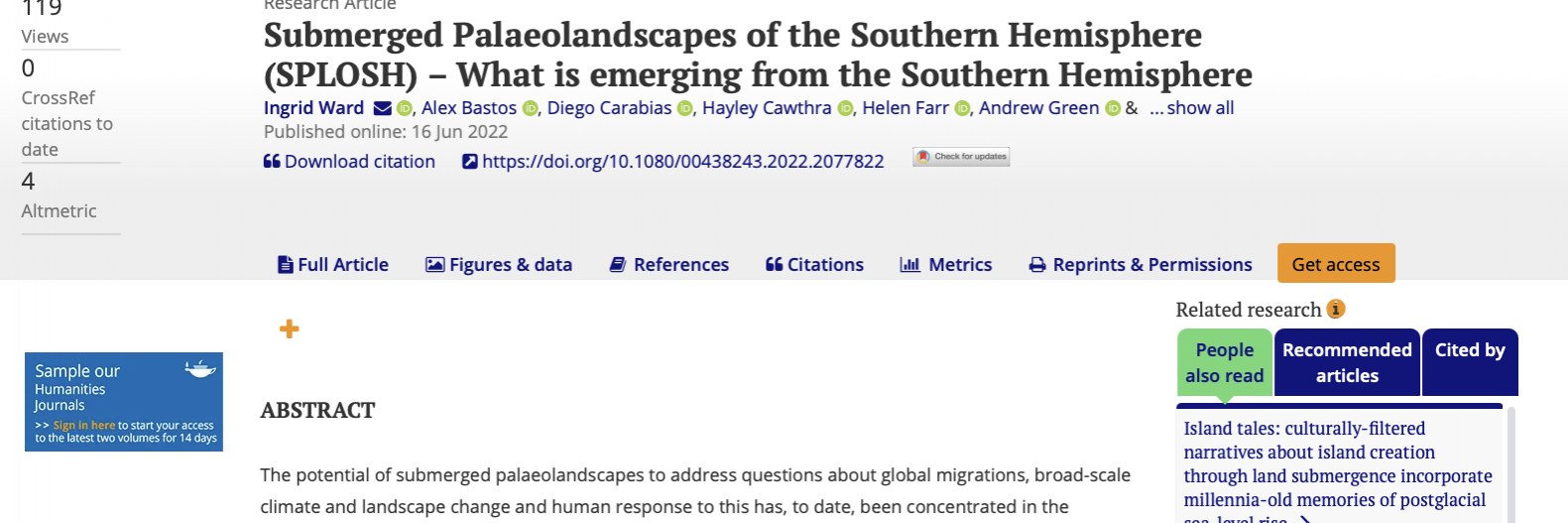 - Investigadores de Australia, Sudáfrica, Reino Unido, Chile y Brasil publicaron el paper “Submerged Palaeolandscapes of the Southern Hemisphere (SPLOSH) – What is emerging from the Southern Hemisphere”, en español: “Paleopaisajes Sumergidos del HemisferioSur (SPLOSH) – Lo que está emergiendo del Hemisferio Sur”. Dirigida por la Dra. Ingrid Ward, de la University of Western Australia, la publicación analiza a nivel global el estado del arte sobre paleopaisajes sumergidos del hemisferio sur, y contó, entre otros, con la participación del Dr. Fraser Sturt (U. de Southampton) y Diego Carabias (ARQMAR), todos investigadores del Núcleo Milenio Océano, Patrimonio y Cultura (OHC).